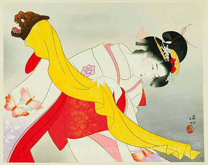 Nous vous proposons une reproduction artisanale sur toile du célèbre tableau 'Kagamijishi Kabuki Danza' de Ito Shinsui, provenant du Musée de la Reproduction.
