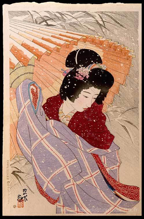 Nous vous proposons une reproduction artisanale sur toile du célèbre tableau 'La tempête de neige' de Ito Shinsui, provenant du Musée de la Reproduction.