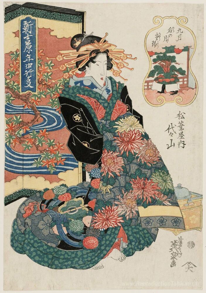 Nous vous proposons une reproduction artisanale sur toile du célèbre tableau 'Le neuvième mois, Chôyô' de Keisai Eisen, provenant du Musée de la Reproduction.