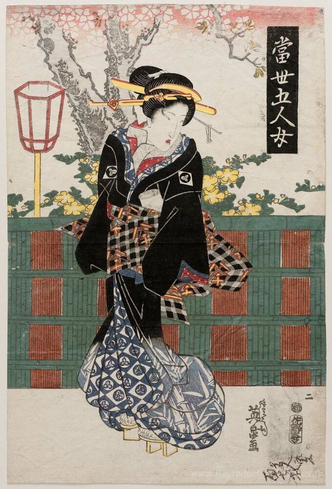 Nous vous proposons une reproduction artisanale sur toile du célèbre tableau 'N ° 2, de la série Versions modernes des cinq femmes (Tôsei Goni' de Keisai Eisen, provenant du Musée de la Reproduction.