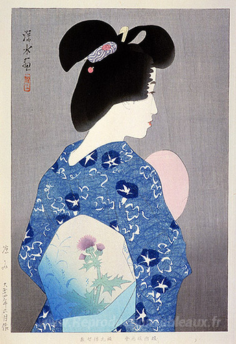 Nous vous proposons une reproduction artisanale sur toile du célèbre tableau 'Obtenir de l'air frais' de Ito Shinsui, provenant du Musée de la Reproduction.