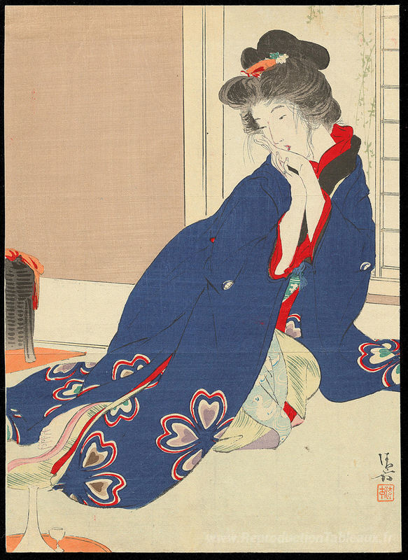 Nous vous proposons une reproduction artisanale sur toile du célèbre tableau 'Pêche écarlate' de Kiyokata Kaburagi, provenant du Musée de la Reproduction.