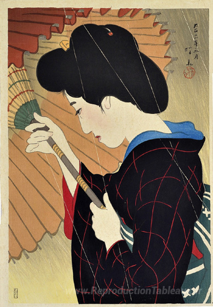 Nous vous proposons une reproduction artisanale sur toile du célèbre tableau 'Pluie passante' de Ito Shinsui, provenant du Musée de la Reproduction.