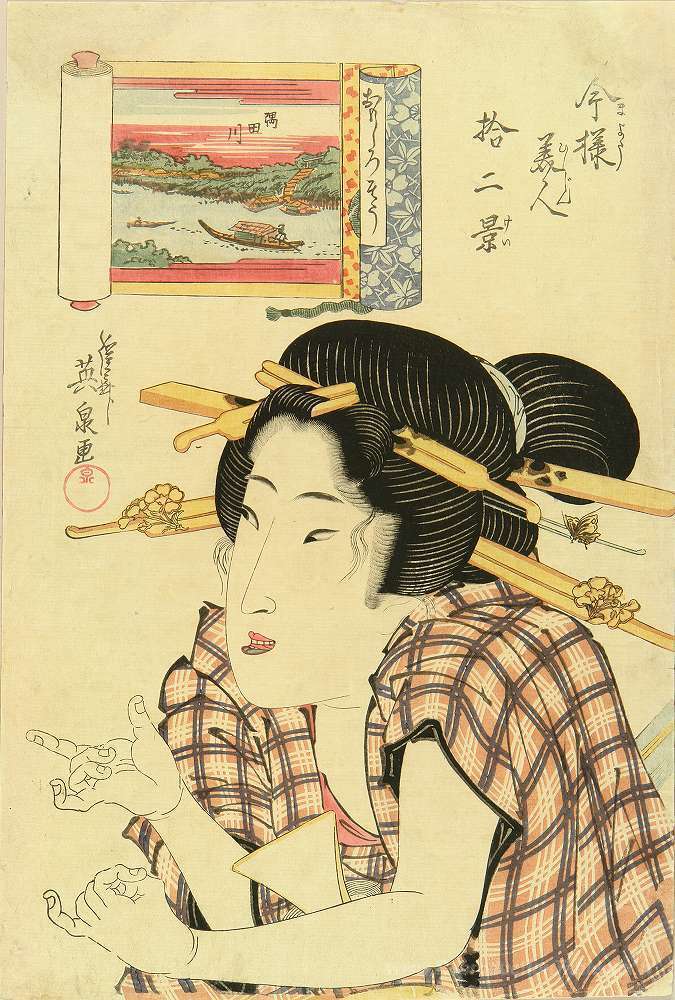 Nous vous proposons une reproduction artisanale sur toile du célèbre tableau 'Un portrait buste d'une beauté' de Keisai Eisen, provenant du Musée de la Reproduction.