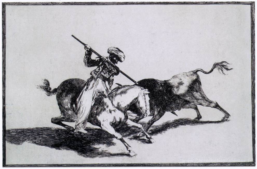 Nous vous proposons une reproduction artisanale sur toile du célèbre tableau 'Le Gazul de Morisco est le premier à combattre les taureaux avec' de Francisco Goya, provenant du Musée de la Reproduction.