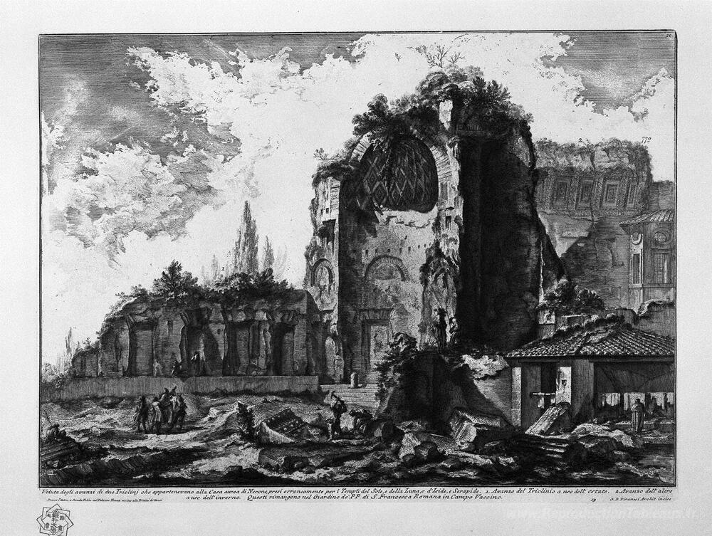 Nous vous proposons une reproduction artisanale sur toile du célèbre tableau 'Une vue des restes de deux Triclinj qui appartenait à la maison ' de Giovanni Battista Piranesi, provenant du Musée de la Reproduction.