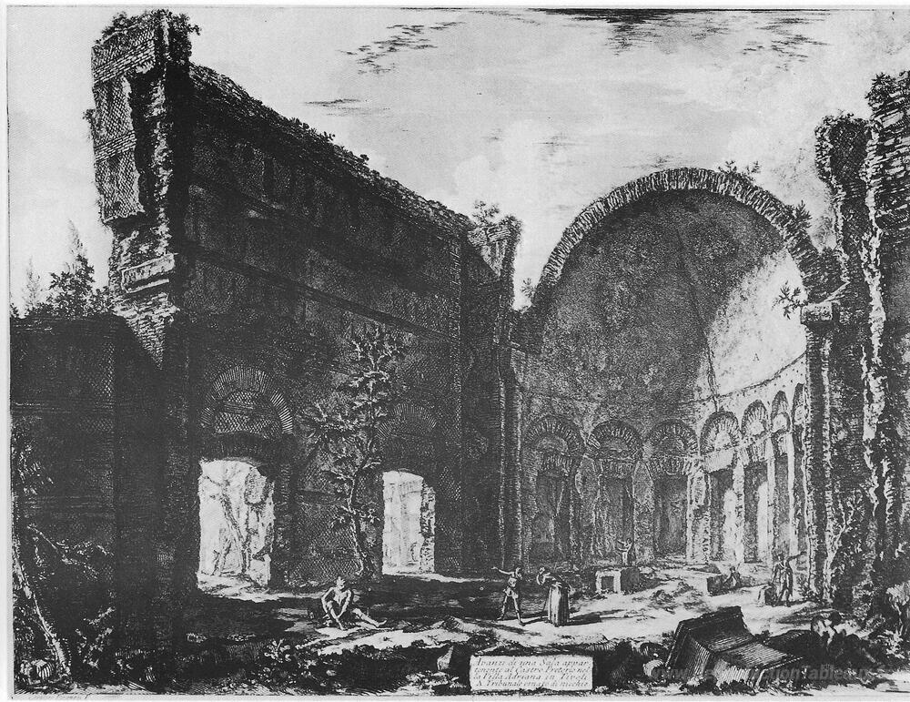 Nous vous proposons une reproduction artisanale sur toile du célèbre tableau 'Vedute di Roma' de Giovanni Battista Piranesi, provenant du Musée de la Reproduction.