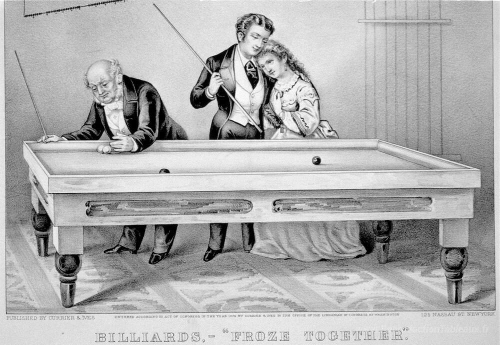 Nous vous proposons une reproduction artisanale sur toile du célèbre tableau 'Billard. Gelé ensemble' de Currier and Ives, provenant du Musée de la Reproduction.