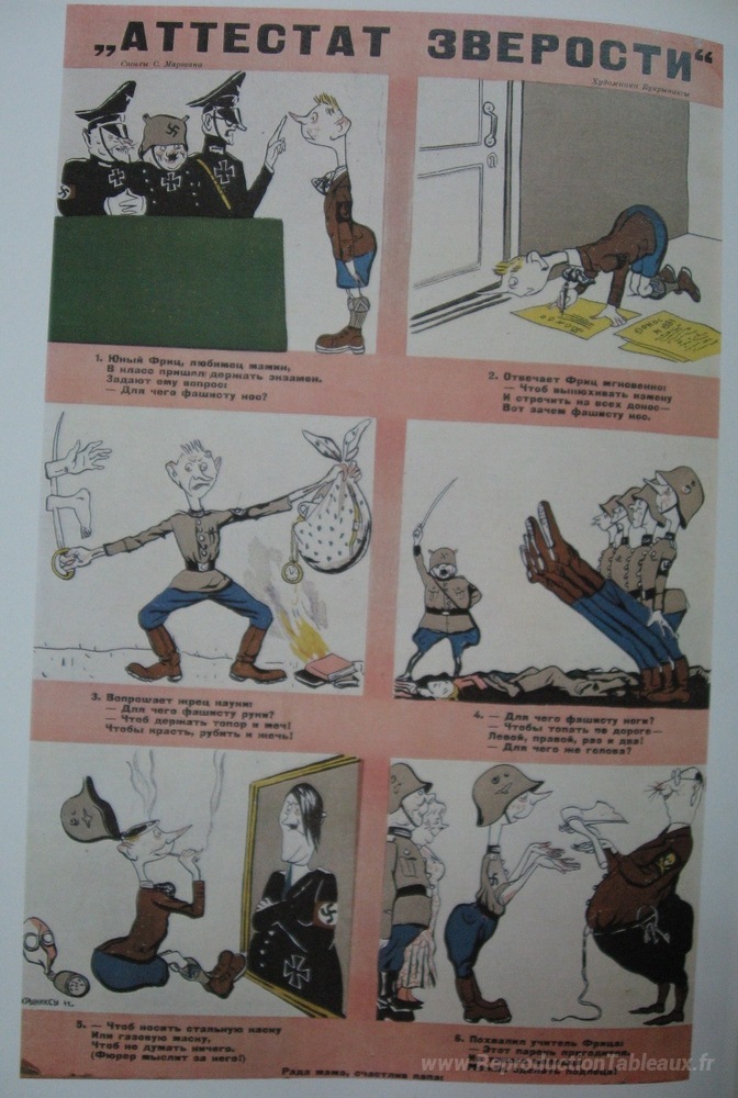 Nous vous proposons une reproduction artisanale sur toile du célèbre tableau 'Certificat d'éducation animal' de Kukryniksy, provenant du Musée de la Reproduction.