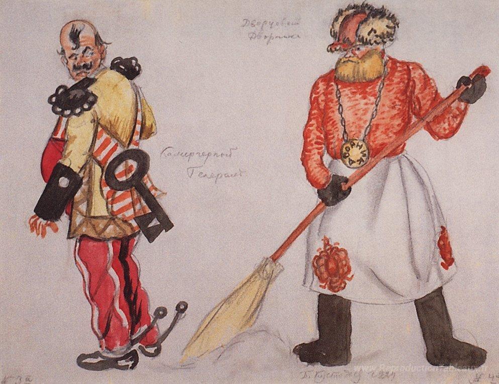 Nous vous proposons une reproduction artisanale sur toile du célèbre tableau 'General et Palace Porter' de Boris Kustodiev, provenant du Musée de la Reproduction.
