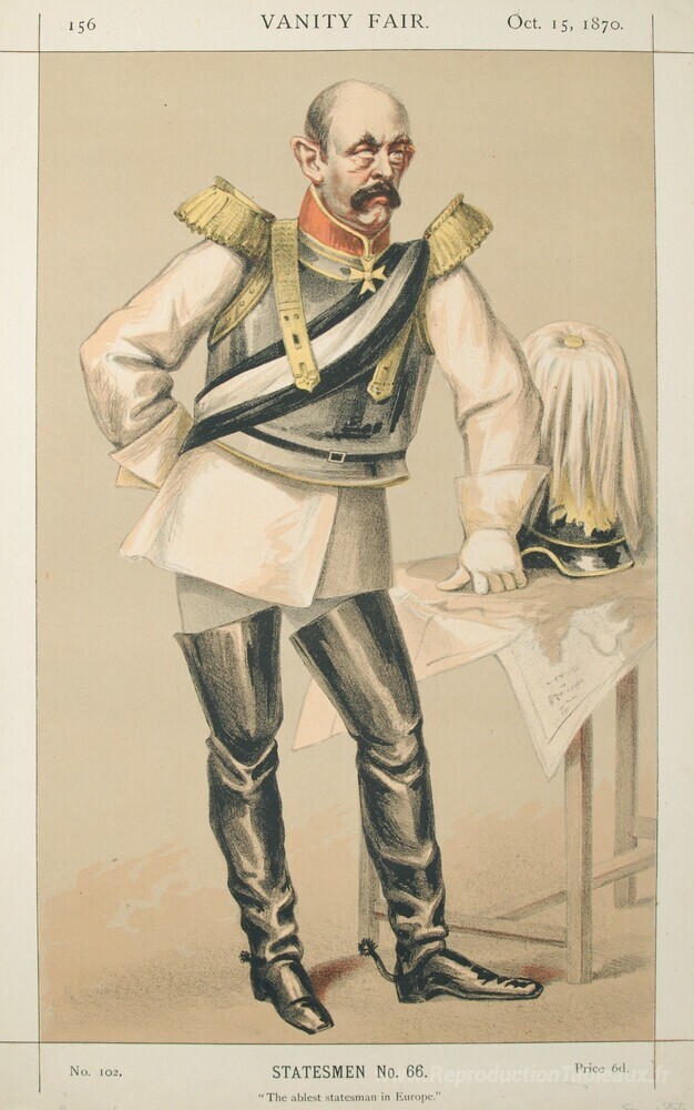 Nous vous proposons une reproduction artisanale sur toile du célèbre tableau 'Hommes d'État n ° 660 Caricature du comte von bismarck Schoenuse' de James Tissot, provenant du Musée de la Reproduction.