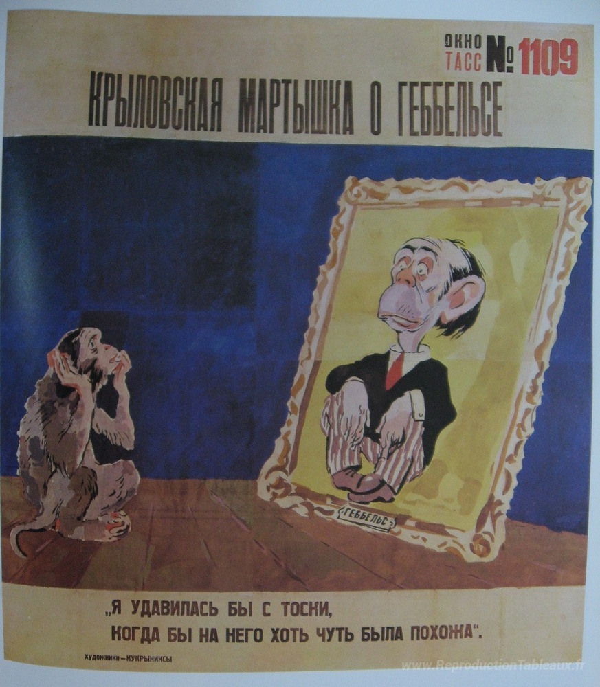 Bienvenue dans notre galerie dédiée aux Kukryniksy, un célèbre trio d'artistes soviétiques, réputés pour leurs œuvres provocatrices et engagées. À travers leur création emblématique, Marquette de Krylov sur Goebbels (la fenêtre Tass № 1109), ils nous invitent à explorer une interprétation audacieuse et satirique de l'époque, alliant habilement réalisme et humour. Leur style unique se distingue par des couleurs vibrantes et des compositions dynamiques, captivant l'œil et suscitant la réflexion.