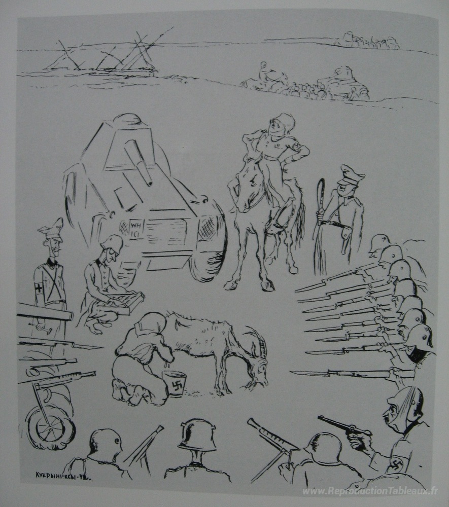 Nous vous proposons une reproduction artisanale sur toile du célèbre tableau 'Sans titre' de Kukryniksy, provenant du Musée de la Reproduction.