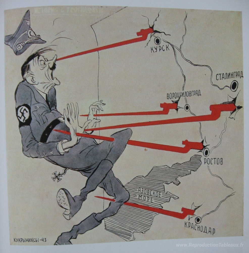 Nous vous proposons une reproduction artisanale sur toile du célèbre tableau 'Sans titre' de Kukryniksy, provenant du Musée de la Reproduction.