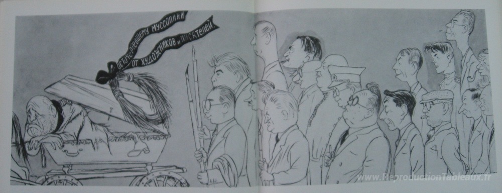 Nous vous proposons une reproduction artisanale sur toile du célèbre tableau 'Sans titre' de Kukryniksy, provenant du Musée de la Reproduction.