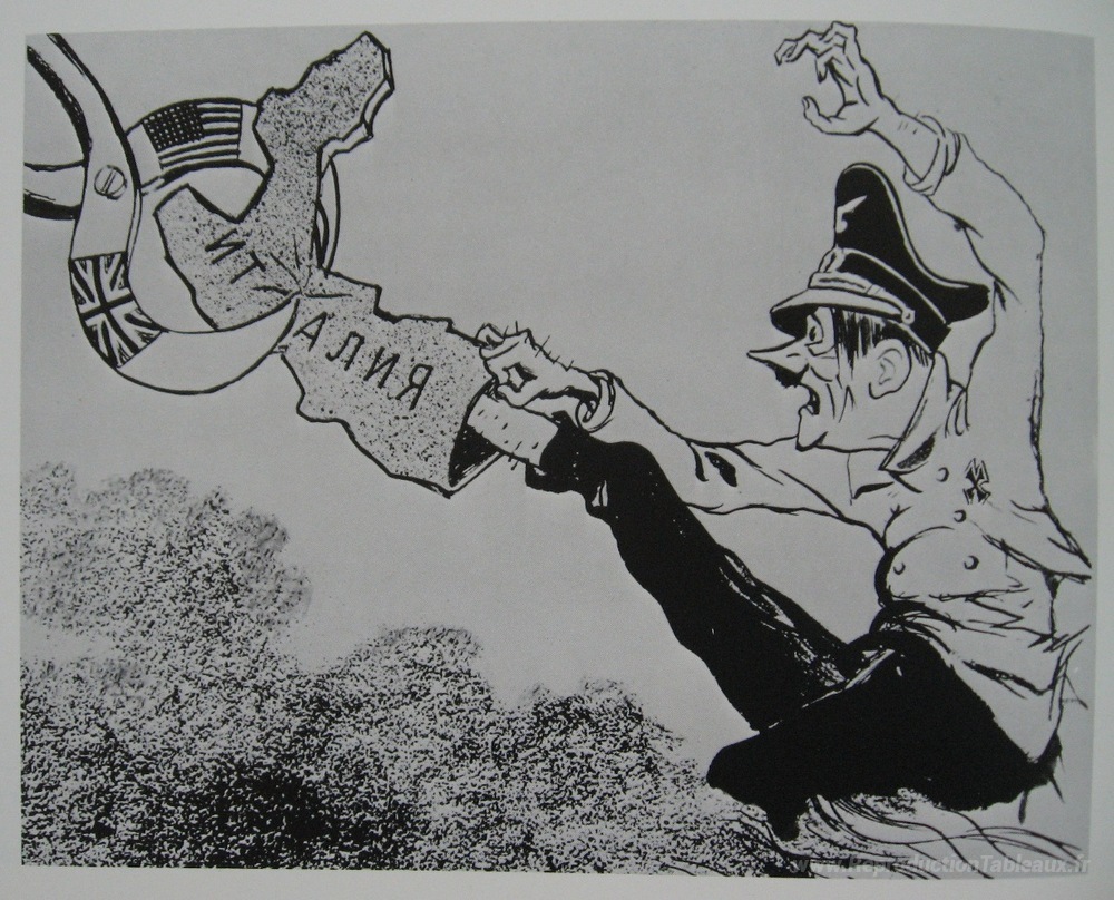 Nous vous proposons une reproduction artisanale sur toile du célèbre tableau 'Sans titre' de Kukryniksy, provenant du Musée de la Reproduction.