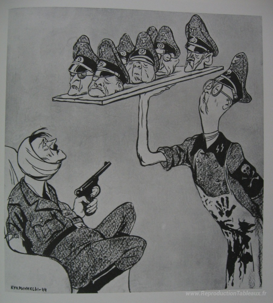Nous vous proposons une reproduction artisanale sur toile du célèbre tableau 'Sans titre' de Kukryniksy, provenant du Musée de la Reproduction.