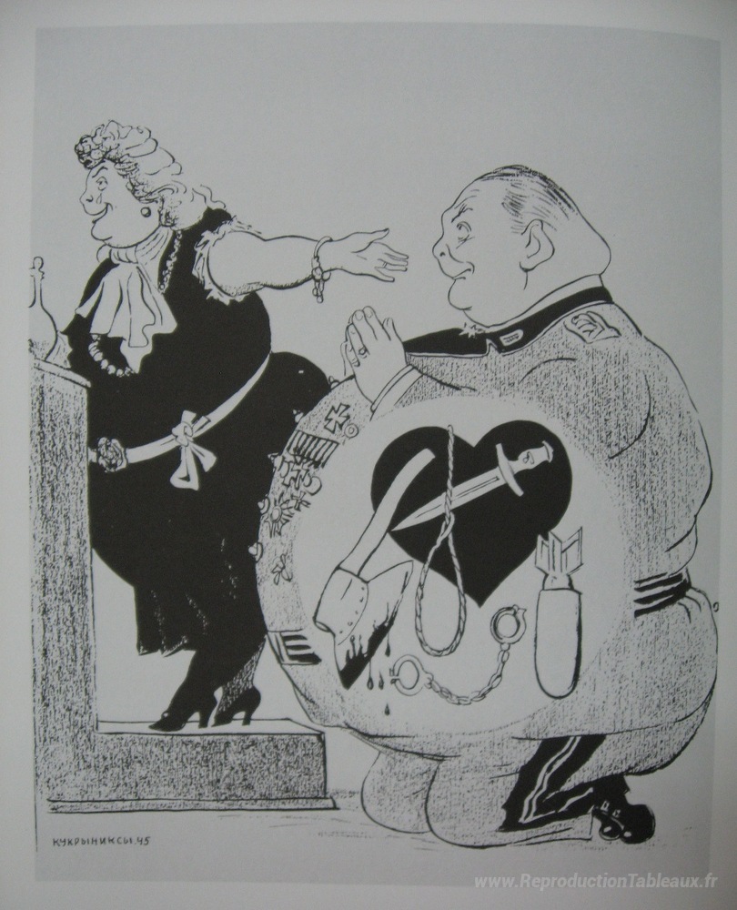 Nous vous proposons une reproduction artisanale sur toile du célèbre tableau 'Sans titre' de Kukryniksy, provenant du Musée de la Reproduction.