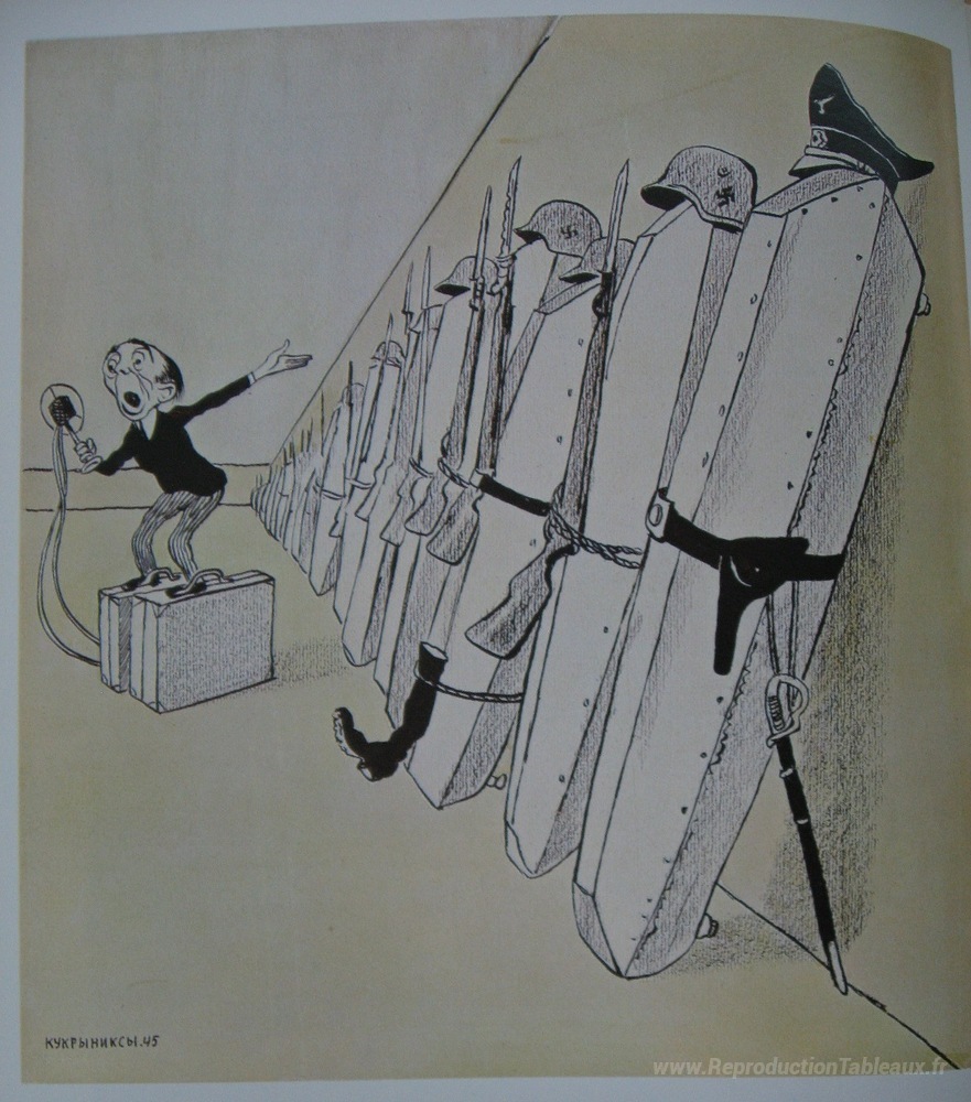Nous vous proposons une reproduction artisanale sur toile du célèbre tableau 'Sans titre' de Kukryniksy, provenant du Musée de la Reproduction.