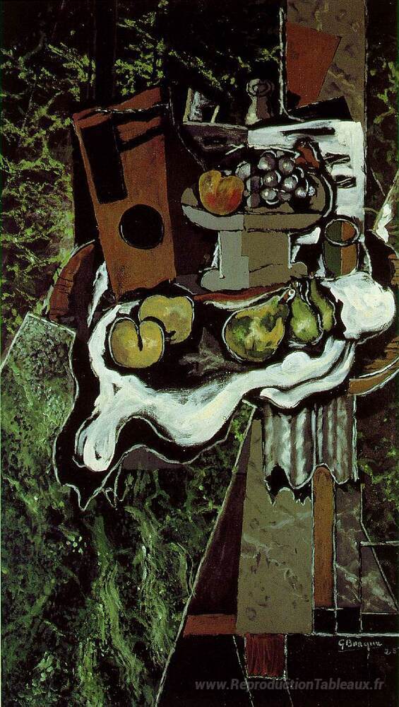Nous vous proposons une reproduction artisanale sur toile du célèbre tableau 'Fruit sur une nappe avec un fruitdish' de Georges Braque, provenant du Musée de la Reproduction.