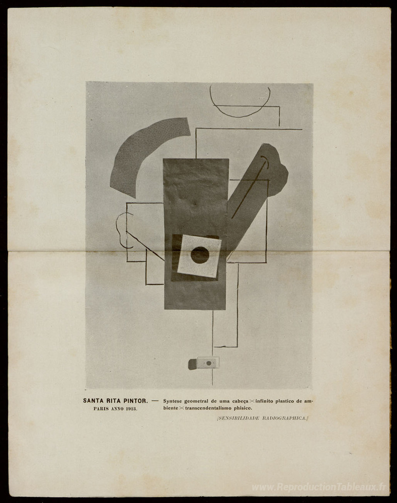 Nous vous proposons une reproduction artisanale sur toile du célèbre tableau 'SYNTÉSE Géométral de uma Cabeça x Infinito Plástico de Ambient x' de Guilherme de Santa-Rita, provenant du Musée de la Reproduction.