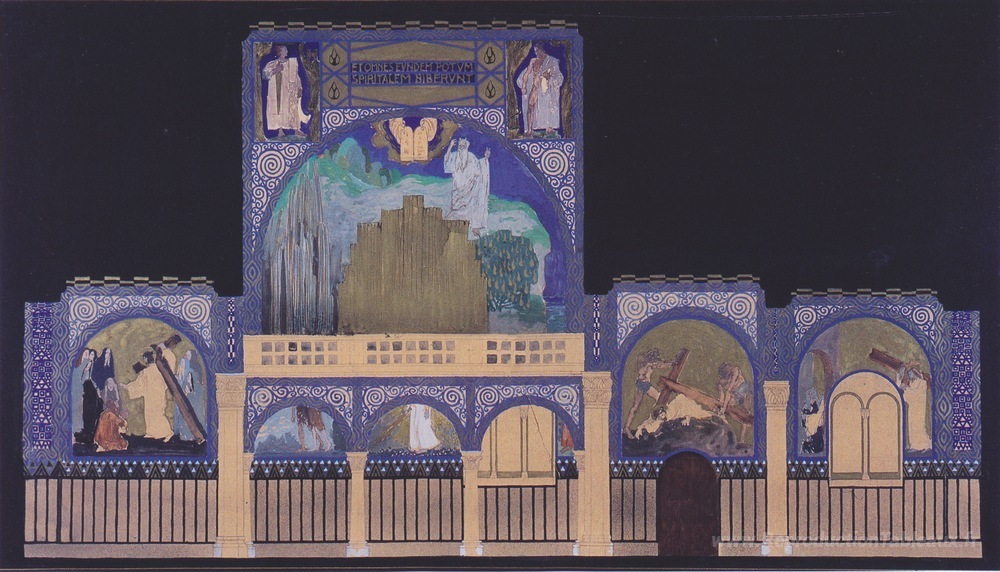 Nous vous proposons une reproduction artisanale sur toile du célèbre tableau 'Église du Saint-Esprit à Düsseldorf, conception du mur d'entrée' de Koloman Moser, provenant du Musée de la Reproduction.
