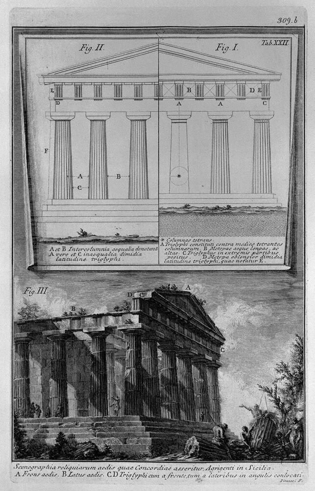 Nous vous proposons une reproduction artisanale sur toile du célèbre tableau 'Élévations de conception et le temple de Concordia à Agrigento' de Giovanni Battista Piranesi, provenant du Musée de la Reproduction.