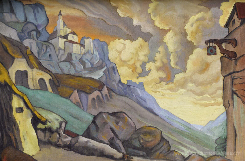 Nous vous proposons une reproduction artisanale sur toile du célèbre tableau 'Étude de la conception de la scène pour "Fuente Ovehuna"' de Nicholas Roerich, provenant du Musée de la Reproduction.