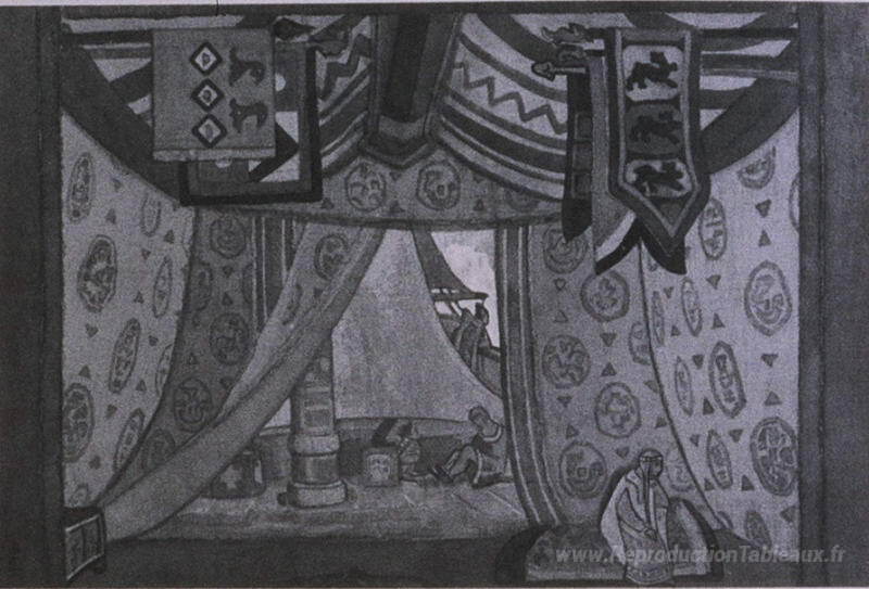 Nous vous proposons une reproduction artisanale sur toile du célèbre tableau 'Étude de la conception de la scène pour "Tristan und Isolde"' de Nicholas Roerich, provenant du Musée de la Reproduction.