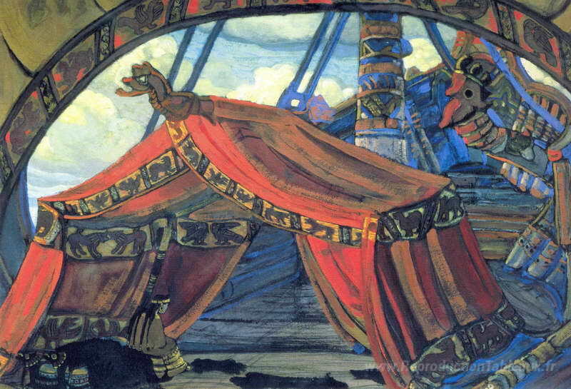 Nous vous proposons une reproduction artisanale sur toile du célèbre tableau 'Étude de la conception de la scène pour "Tristan und Isolde"' de Nicholas Roerich, provenant du Musée de la Reproduction.
