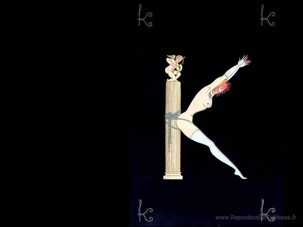 Nous vous proposons une reproduction artisanale sur toile du célèbre tableau 'Alfabeto K' de Erte, provenant du Musée de la Reproduction.
