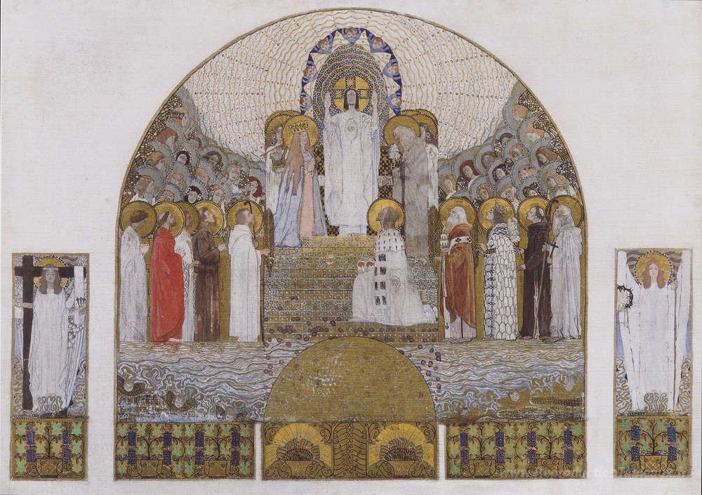 Nous vous proposons une reproduction artisanale sur toile du célèbre tableau 'Am Steinhof Church, conception de la mosaïque pour l'autel princ' de Koloman Moser, provenant du Musée de la Reproduction.
