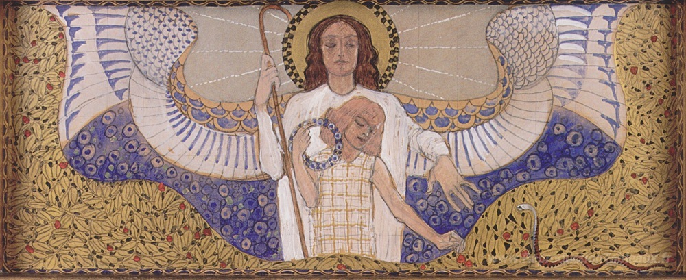 Nous vous proposons une reproduction artisanale sur toile du célèbre tableau 'Am Steinhof Church, conception du côté droit ange gardien de l'a' de Koloman Moser, provenant du Musée de la Reproduction.