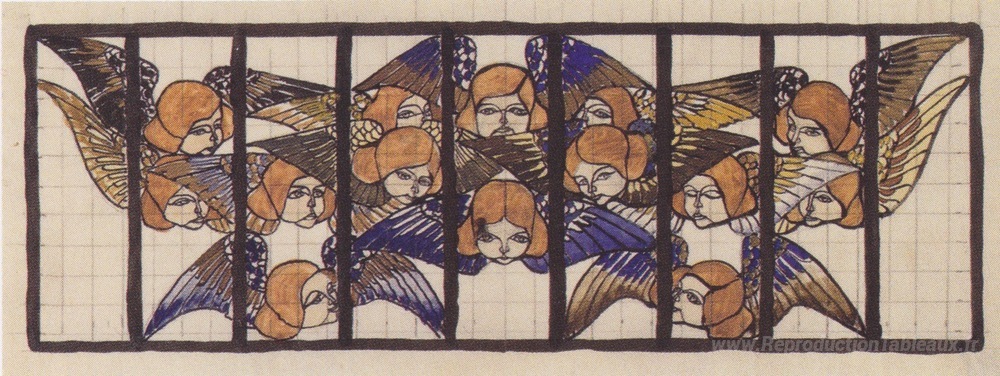 Nous vous proposons une reproduction artisanale sur toile du célèbre tableau 'Am Steinhof Church, conception pour la fenêtre de montée' de Koloman Moser, provenant du Musée de la Reproduction.