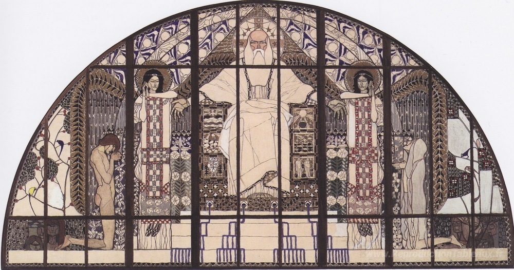 Nous vous proposons une reproduction artisanale sur toile du célèbre tableau 'Am Steinhof Church, croquis coloré de South Window' de Koloman Moser, provenant du Musée de la Reproduction.