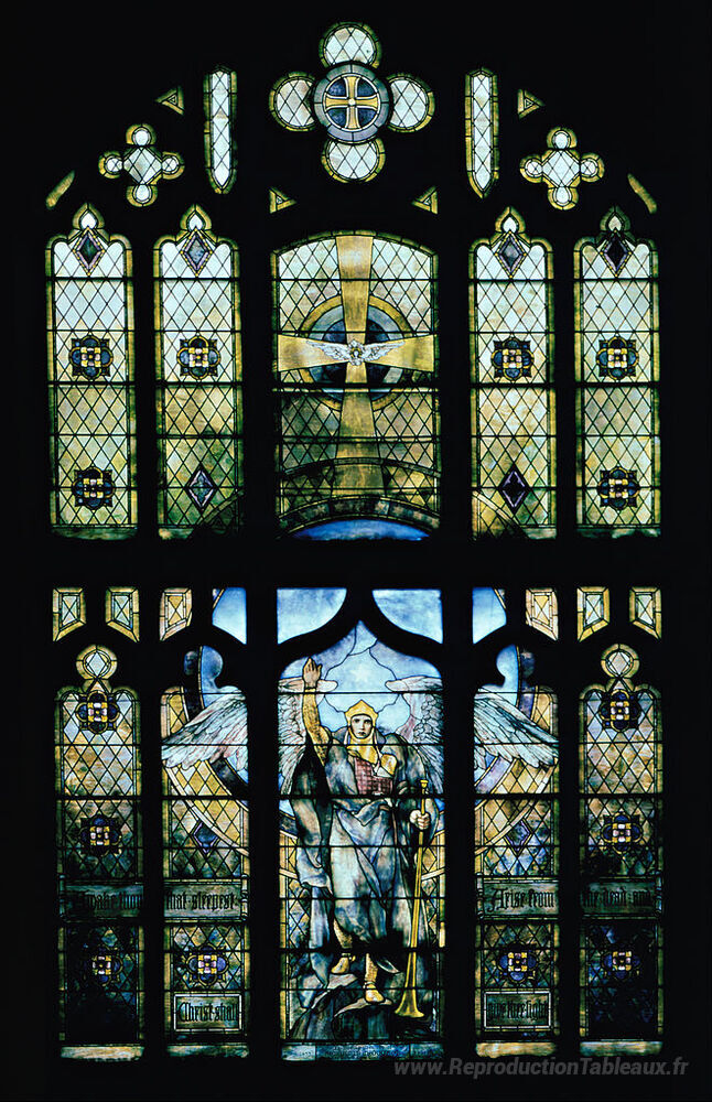 Nous vous proposons une reproduction artisanale sur toile du célèbre tableau 'Ange de la résurrection' de Louis Comfort Tiffany, provenant du Musée de la Reproduction.