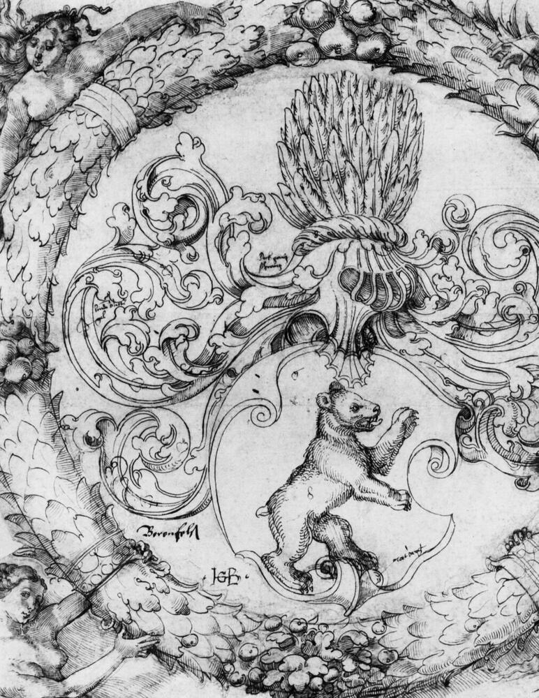 Nous vous proposons une reproduction artisanale sur toile du célèbre tableau 'Armoiries Basler Adelberg III de Bear Rock, Lord Arisdorf' de Hans Baldung, provenant du Musée de la Reproduction.