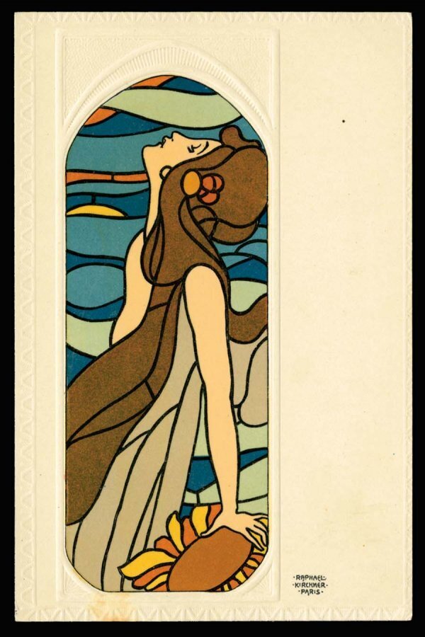 Nous vous proposons une reproduction artisanale sur toile du célèbre tableau 'Art des vitraux' de Raphael Kirchner, provenant du Musée de la Reproduction.
