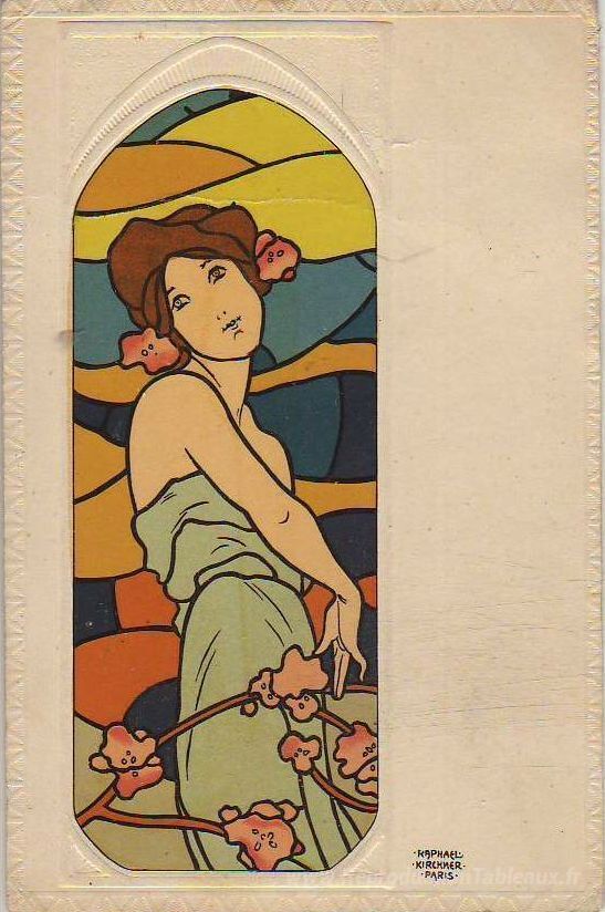 Nous vous proposons une reproduction artisanale sur toile du célèbre tableau 'Art des vitraux' de Raphael Kirchner, provenant du Musée de la Reproduction.