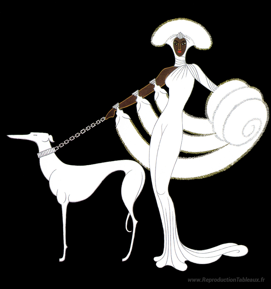 Nous vous proposons une reproduction artisanale sur toile du célèbre tableau 'Au théâtre, en ébène et blanc' de Erte, provenant du Musée de la Reproduction.