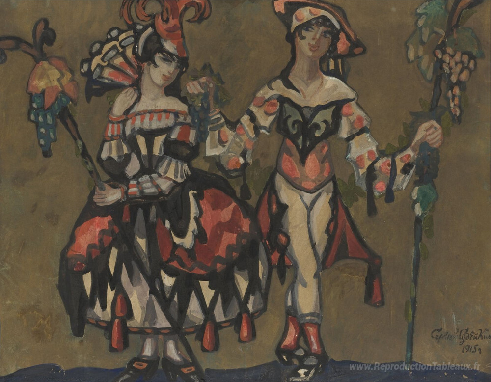 Nous vous proposons une reproduction artisanale sur toile du célèbre tableau 'Bergers et berger' de Serge Sudeikin, provenant du Musée de la Reproduction.