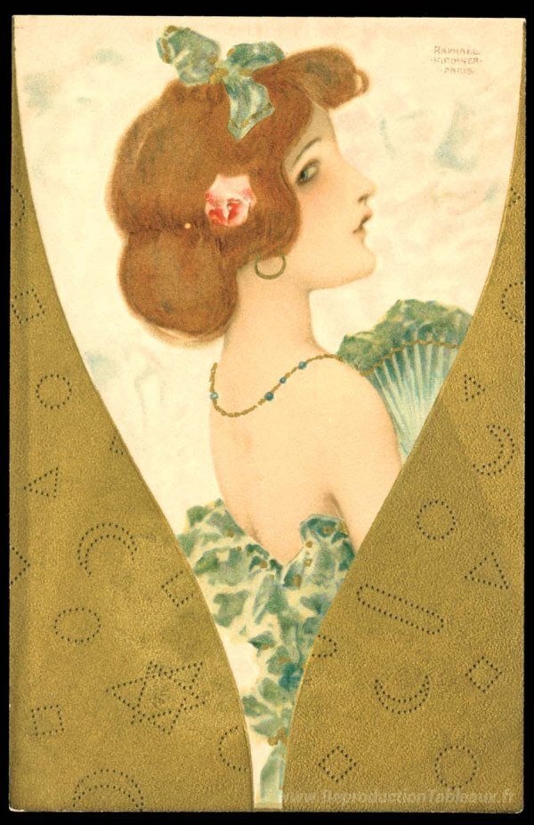 Nous vous proposons une reproduction artisanale sur toile du célèbre tableau 'Bijoux' de Raphael Kirchner, provenant du Musée de la Reproduction.