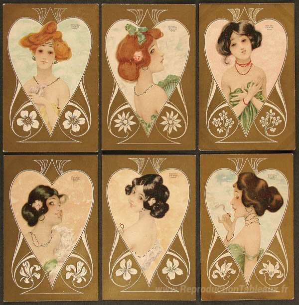 Nous vous proposons une reproduction artisanale sur toile du célèbre tableau 'Bijoux' de Raphael Kirchner, provenant du Musée de la Reproduction.