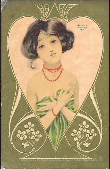 Nous vous proposons une reproduction artisanale sur toile du célèbre tableau 'Bijoux' de Raphael Kirchner, provenant du Musée de la Reproduction.