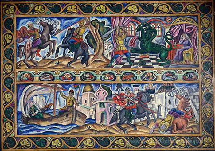 Nous vous proposons une reproduction artisanale sur toile du célèbre tableau 'Bova le prince '. Croquis d'un tapis.' de Pyotr Konchalovsky, provenant du Musée de la Reproduction.