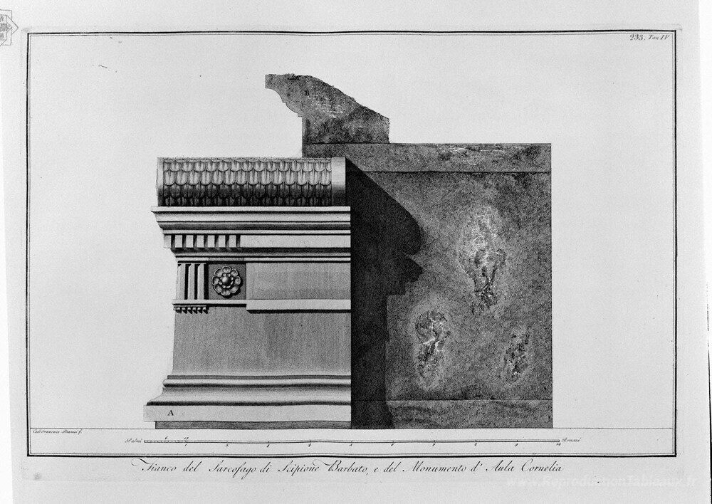 Nous vous proposons une reproduction artisanale sur toile du célèbre tableau 'Côté du sarcophage de Scipio Barbato et du monument de Cornelia ' de Giovanni Battista Piranesi, provenant du Musée de la Reproduction.