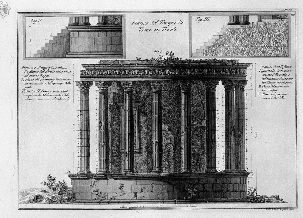 Nous vous proposons une reproduction artisanale sur toile du célèbre tableau 'Côté du temple de Vesta à Tivoli' de Giovanni Battista Piranesi, provenant du Musée de la Reproduction.