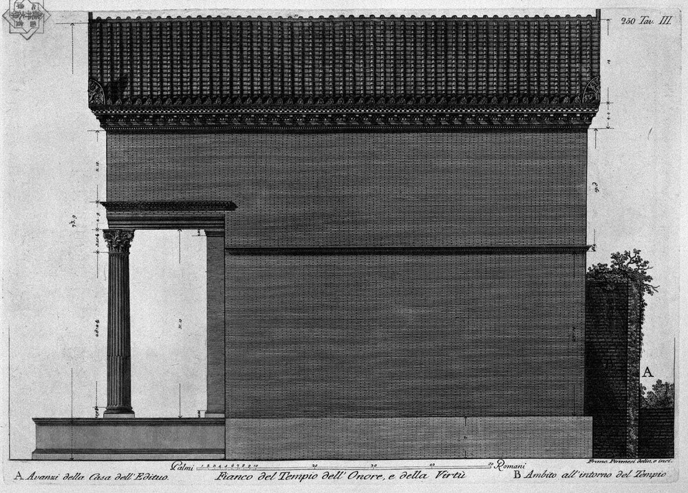 Nous vous proposons une reproduction artisanale sur toile du célèbre tableau 'Côté du temple d'honneur et de vertu' de Giovanni Battista Piranesi, provenant du Musée de la Reproduction.