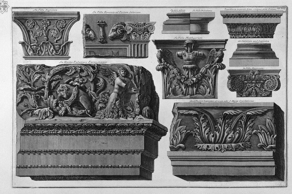 Nous vous proposons une reproduction artisanale sur toile du célèbre tableau 'Capitals and Friezes (jardins farnese, villas romaines)' de Giovanni Battista Piranesi, provenant du Musée de la Reproduction.