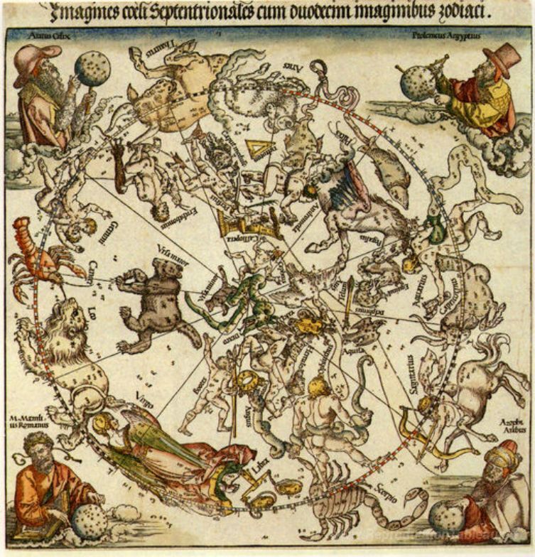 Nous vous proposons une reproduction artisanale sur toile du célèbre tableau 'Carte du ciel du nord avec des représentations des constellation' de Albrecht Durer, provenant du Musée de la Reproduction.